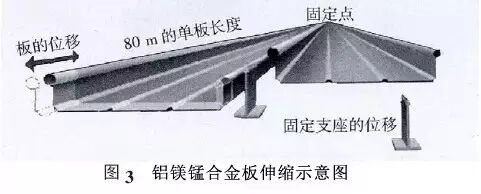屋面板基材通常采用国际牌号AA3004 的铝镁锰合金压型制作,合金状态为H36/H46。其屈服强度≥190 MPa,抗拉强度在240~285 MPa,伸长率≥3%。收边板基材采用国际牌号AA3004 的铝镁锰合金压型制作,合金状态为H34/H44,其屈服强度170MPa ,抗拉强度在220~265 MPa ,伸长率≥3%。