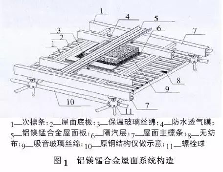 铝镁锰合金屋面系统的构造,由下到上分别为:屋面底板:采用穿孔镀铝锌或镀锌压型钢板,其厚度根据檩条距离来设计,穿孔率则根据项目计算求得。