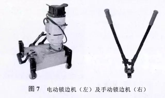 1)电动锁边机,用于锁紧板肋,使板与固定座连结牢固,见图7(左)。