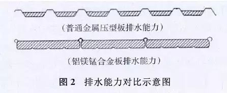 2)**限度地利用面板横截面积排水,排水效率高。与普通金属压型板排水能力对比,见图2;