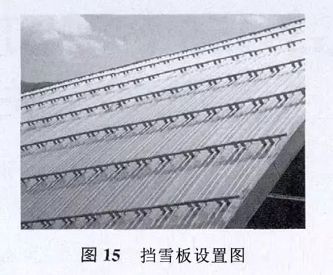 北方地区的屋面一般需要设置挡雪板。挡雪板材质一般为不锈钢或铝合金。挡雪板可根据屋面的基本雪压和坡度来布置。天沟及檐口上方必须设置挡雪板,挡雪板的设置见图15。