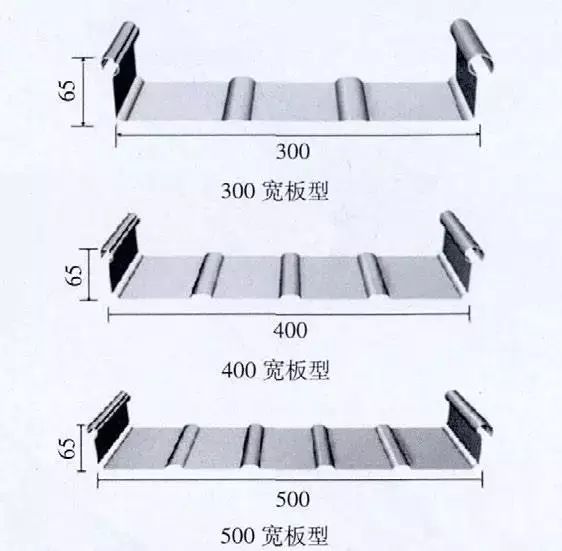直板板型肋高一般为65 mm,常用的板宽有300mm、400 mm 及500 mm(图9)。其中板宽300mm 的在屋面荷载较大时使用;400 mm 的为常用、经济型的;500 mm 的为屋面板本身最经济的板型,但下部檩条间距小,且需采取适当措施防止板变形。板型详况,见图10。