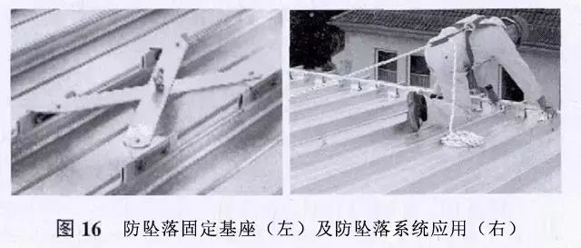 屋面的定期检查、暴风雪后清洁屋面和天沟、屋面改造,这些都需要屋面设置防坠落系统。防坠落系统包括一个坚固、耐久且灵活的不锈钢索,该不锈钢索的每一端连接到屋面固定基座支架上。屋面固定基座使用铝夹,连接到屋面板上。屋面固定基座被设计为减震器,一旦坠落发生,将变形减弱坠落的震动,并保障基座仍然安全地固定在屋面板上。