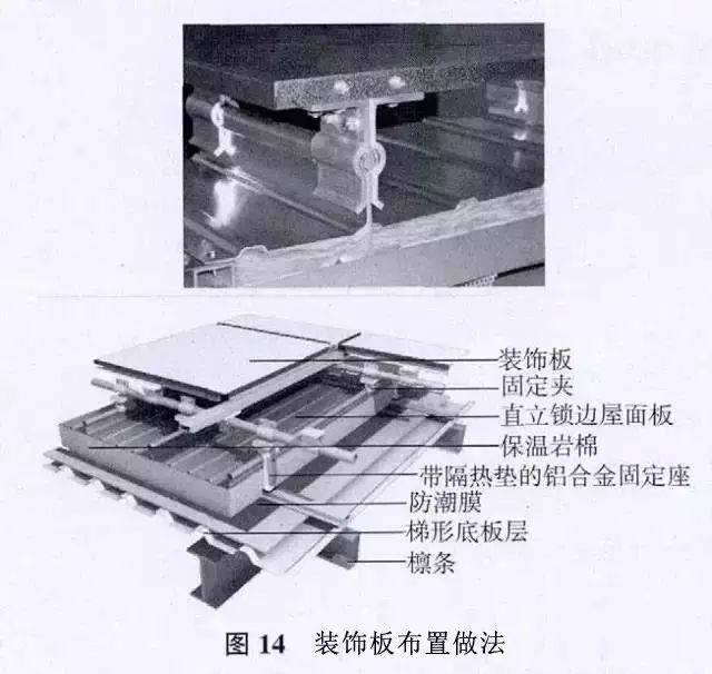 装饰板系统的连接固定,无需在铝镁锰合金板上开洞;两层板之间的开放式连接,无需维护,并可降低清理要求;可调节系统使装饰板可完美布置,装饰板布置做法见图14。